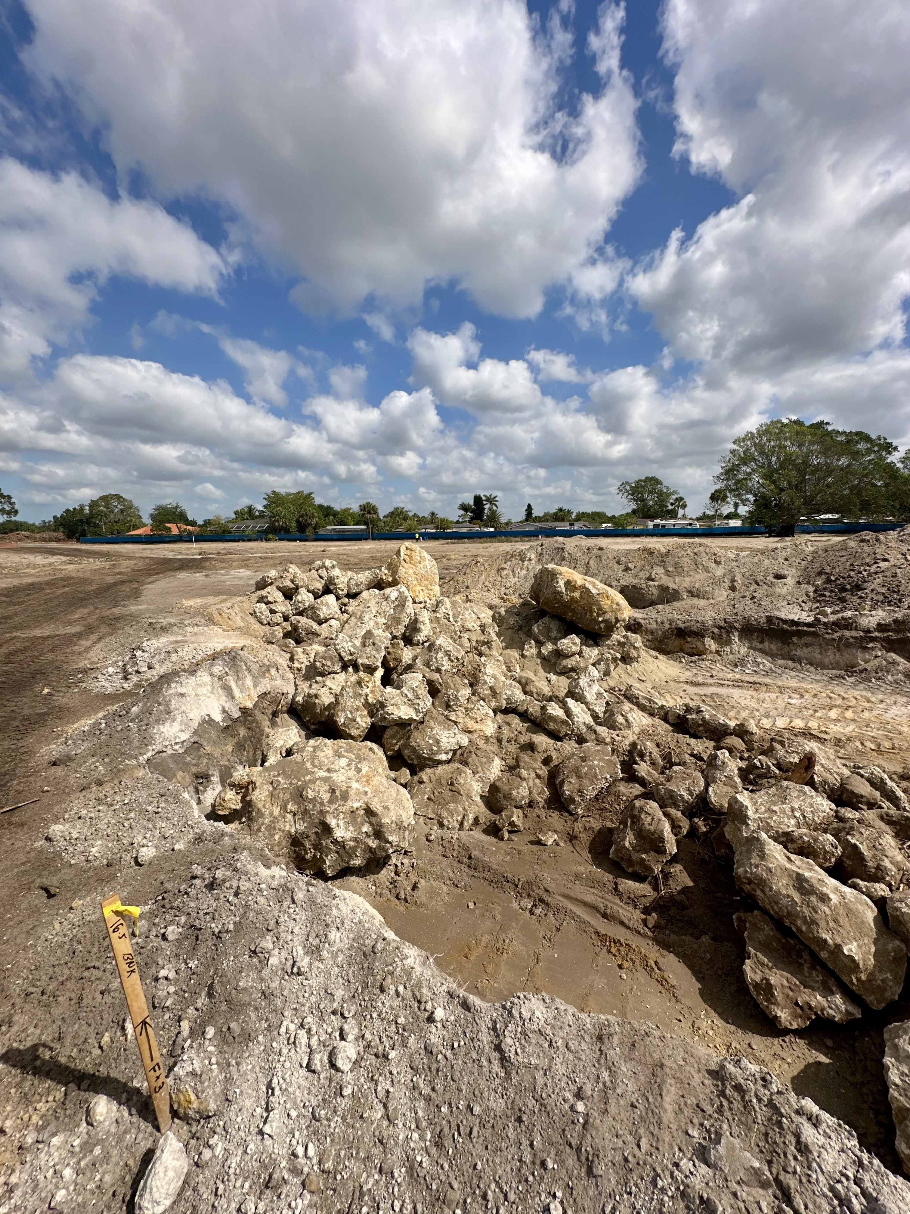 The crew is excavating bedrock in targeted areas and the material will be crushed and reused as base material for the parking lot and building foundations of the “Village” buildings.